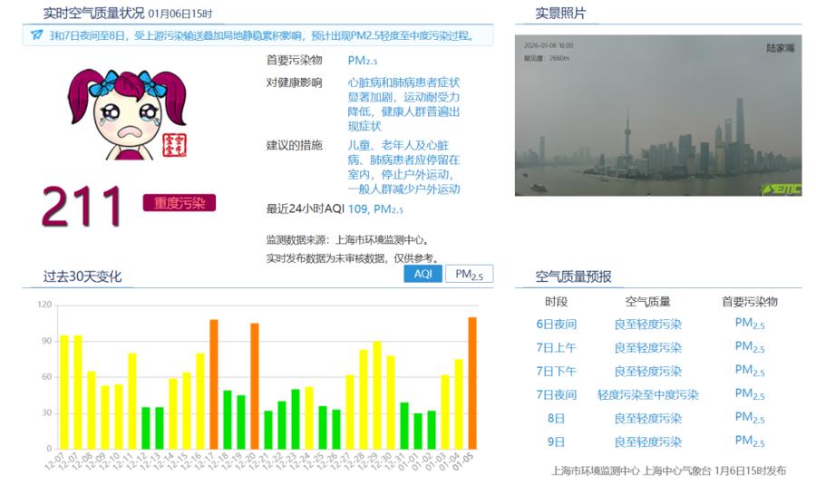 1月6日,据上海市环境监测中心监测数据,当天15时上海市实时空气污染指数为211,达“重度污染”,首要污染物为PM2.5。16时,实时空气污染指数为190,为中度污染,首要污染物为PM2.5。